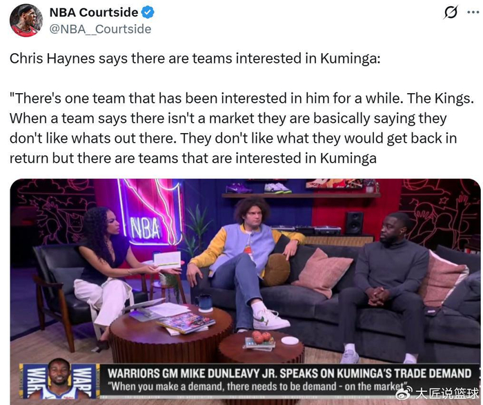 同时库明加的未来依旧悬而未决,名记Chris Haynes表示国王队依旧是市场中唯一有意库明加的球队,但他们提供的筹码勇士不感兴趣。