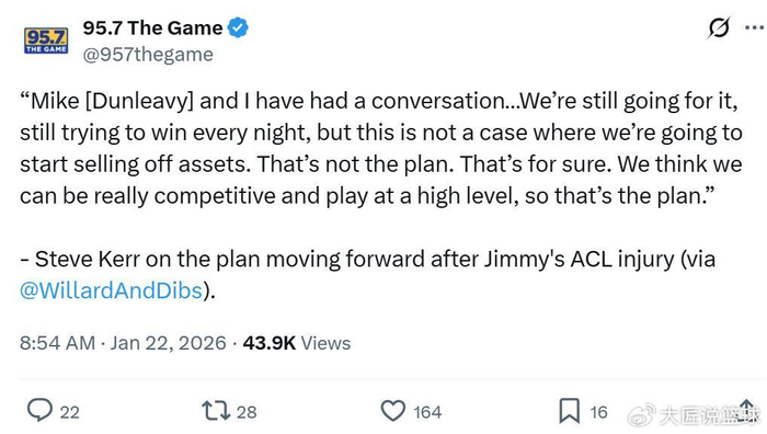 接着科尔透露勇士计划,他说道:“我已经和邓利维谈过了,我们仍然会全力以赴,每个夜晚全力争胜,我们不会出售资产,这绝对不是我们的计划,我们相信我们能够保持竞争力,打出高水准的比赛,这才是我们的计划。”