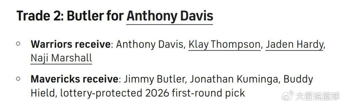 勇士得到:浓眉+克莱+哈迪+马绍尔;