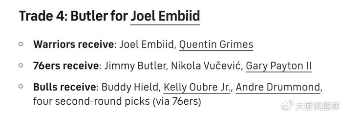 勇士得到:恩比德+格莱姆斯;