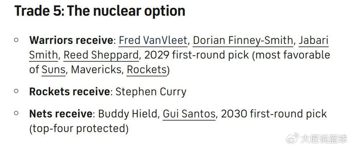 为此,美媒《cbssports》送给勇士队5笔有望扭转局面的大胆交易方案,其中4笔是帮助库里留在勇士争冠,另外一笔则是将库里送往具备争冠能力的火箭队。