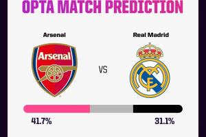 预测中,阿森纳首回合主场取胜的概率为41.7%,皇马客场赢球的概率则是31.1%,两队有27.2%的可能战平。
